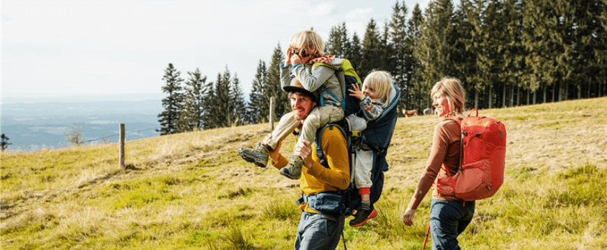 Družina z dvema otrokoma hodi po pašniku, na hrbtih imajo Kibuba nahrbtnike