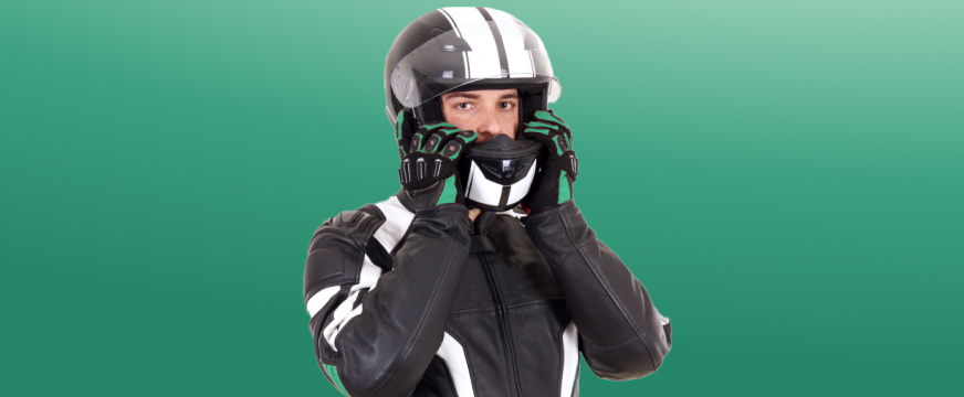 Voznik motorja se drži za čelado, oblečen je v zaščitno motoristično opremo