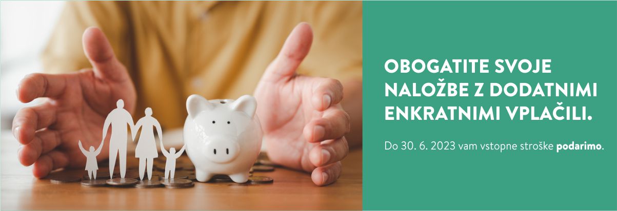 Fotografija papirnate družine, hranilnika denarja in kovancev ter napis Obogatite svoje naložbe z dodatnimi enkratnimi vplačili