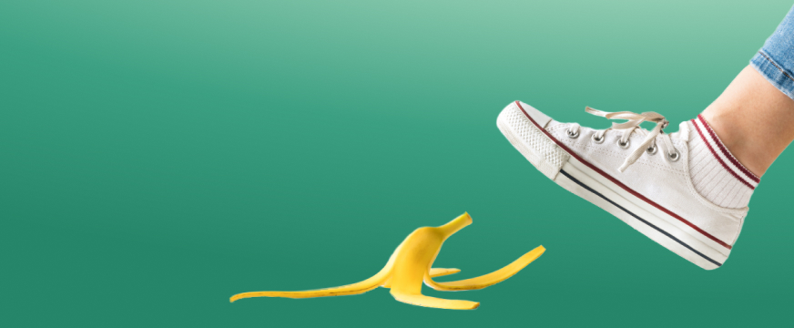 Bananin olupek na zelenem ozadju, na desni strani oseba stopa proti olupku.